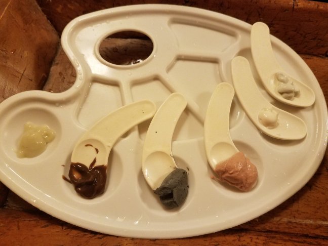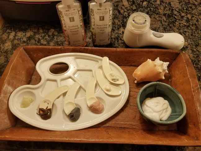 So, through some trial and error I figured out ways to minimize my loss of contact with the client. What I do is scan their face and do an eval when I go to pick up the client. Then I do another quick eval under the Mag lamp just make sure I know what their skin type. This is also when I’m asking what their concerns are and what they want to be addressed during the facial. While they’re getting on the table I will pull products and put them on a little art palette. The art palettes (basically it’s what you would use to put your paint on) you can find at a craft store for cheap. So, the palettes have all these little round divots to put product in and I dish everything out that I’ll need for their service. I always put the products in order of application, so everything is organized and easy to grab. This is also one way to watch your portion control and not use too much product.
